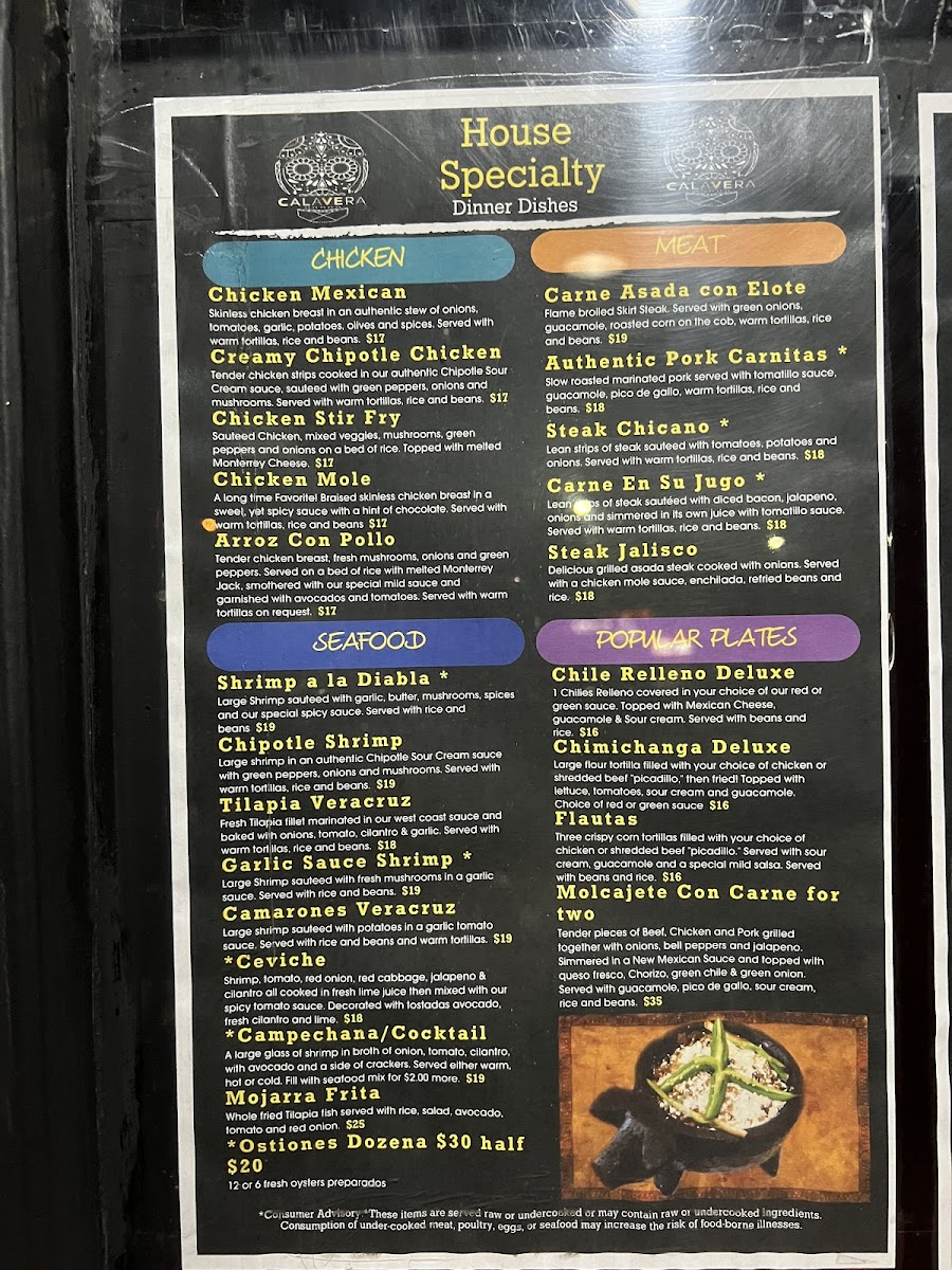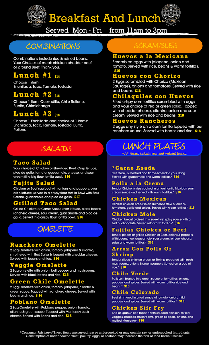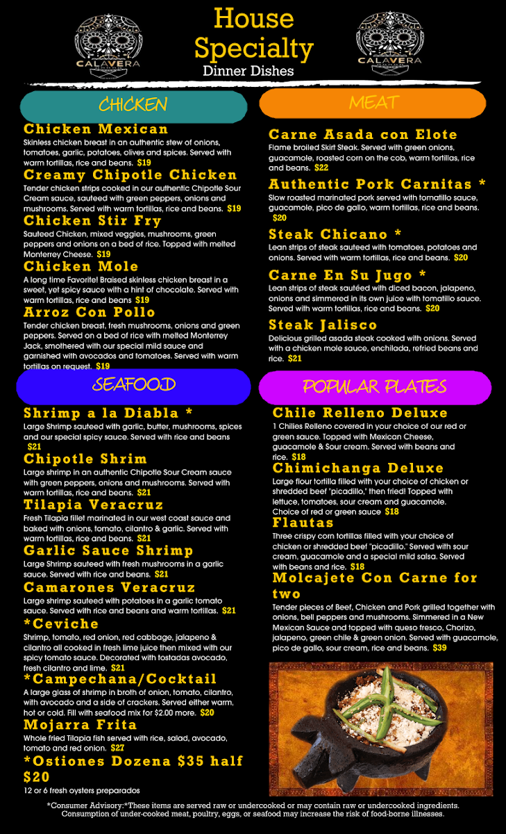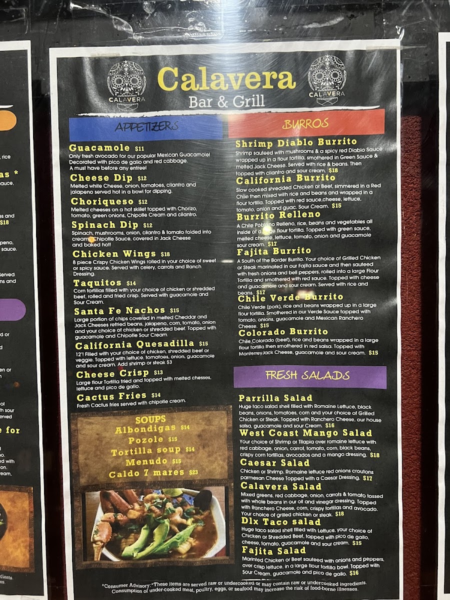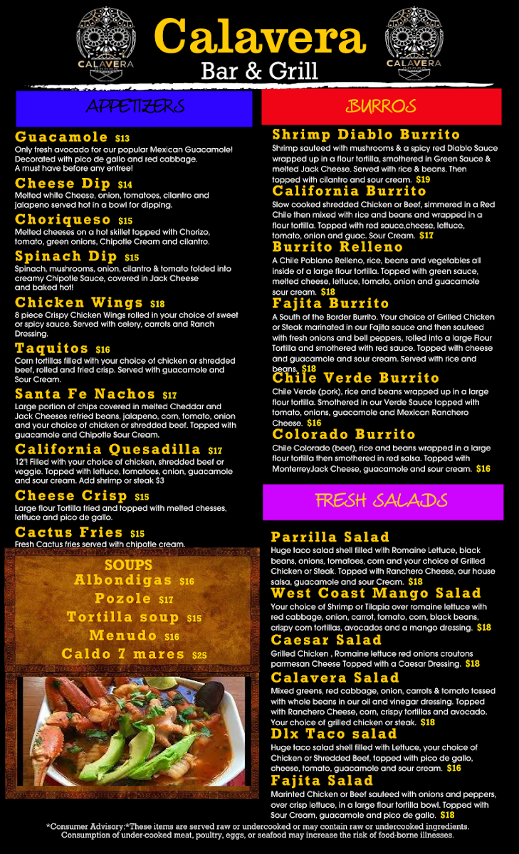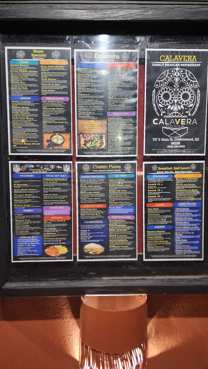 At Calavera Bar And Grill, located in the heart of Cottonwood, Arizona, diners are treated to a vibrant menu that perfectly balances classic Mexican flavors with innovative twists. Start your meal with their signature Guacamole, crafted from fresh avocados and garnished with pico de gallo and red cabbage for $13.00, or indulge in the rich Choriqueso, a hot skillet of melted cheese and chorizo for $15.00.